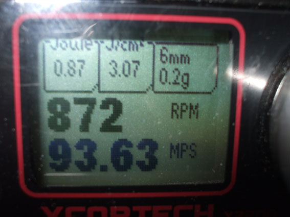 | 0.20g弾使用時で平均92.04m/s 秒間15.25発 分間915発 同じメカボックスでも、バレル長が違うと、これだけの差が出ます。 |